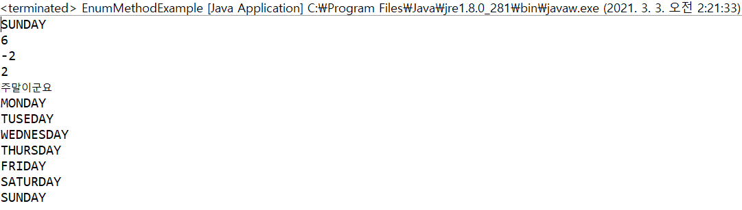 Week[] days = Week.values(); //모든 Week객체들(MONDAY~SUNDAY)을 배열로 만들어 리턴