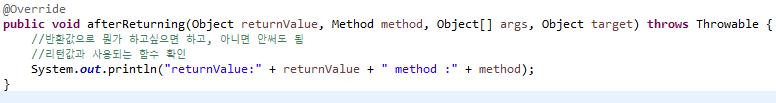 ② logAfterReturningAdvice 클래스는 AfterReturningAdvice를 구현하고, 필수 메소드를 오버라이드한다.