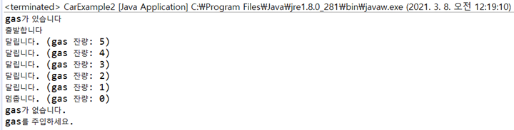 System.out.println("달립니다. (gas 잔량: " + gas + ")");