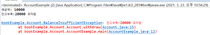 throw new BalanceInsufficientException("잔고부족:" + (money-balance)+" 모자람"); //소괄호 안의 메세지를 매개값으로 >Exception에 돌려줌