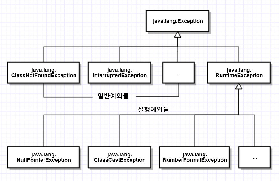 모든 예외 클래스들은 java.lang.Exception 클래스를 상속받는다.