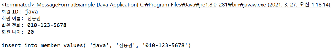 String text = "회원 ID: {0} \n회원 이름: {1} \n회원 전화: {2} \n회원 나이: {3}";