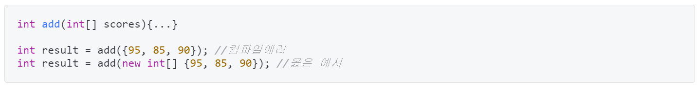 int sum1 = add(new int[] {83, 90, 87}); //2.배열의 생성과 값목록 입력을 동시에 하는 매개변수를 입력한다.