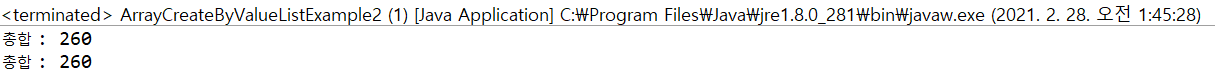 다른 하나는 {83, 90, 87}이란 값을 가진 임의의 배열을 생성하기 위한 매개변수 "new int[] {83, 90, 87}"를 add()메소드의 매개변수로 넣어주는 것이다. 연산이 실행된 후 sum이 return값에 저장되면, 이 값은 sum1에 저장된다. 이후 "총합 : sum1" 출력문이 실행된다.