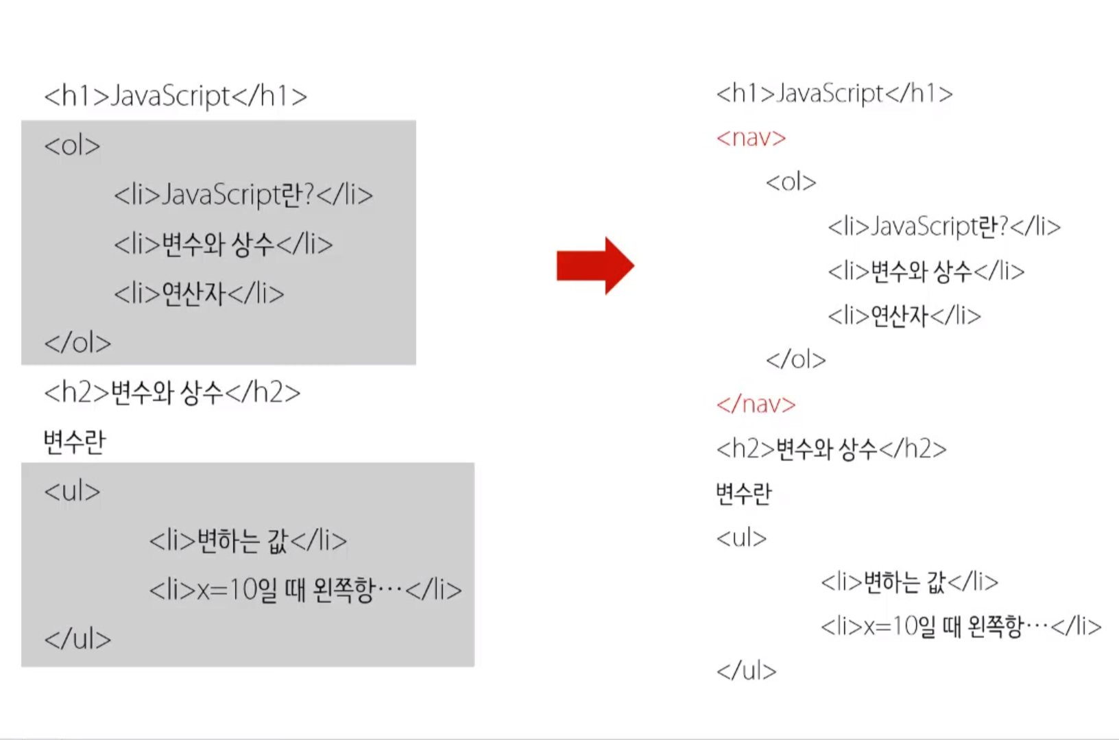 <nav> : 동작이나 기능이 들어간다는 뜻