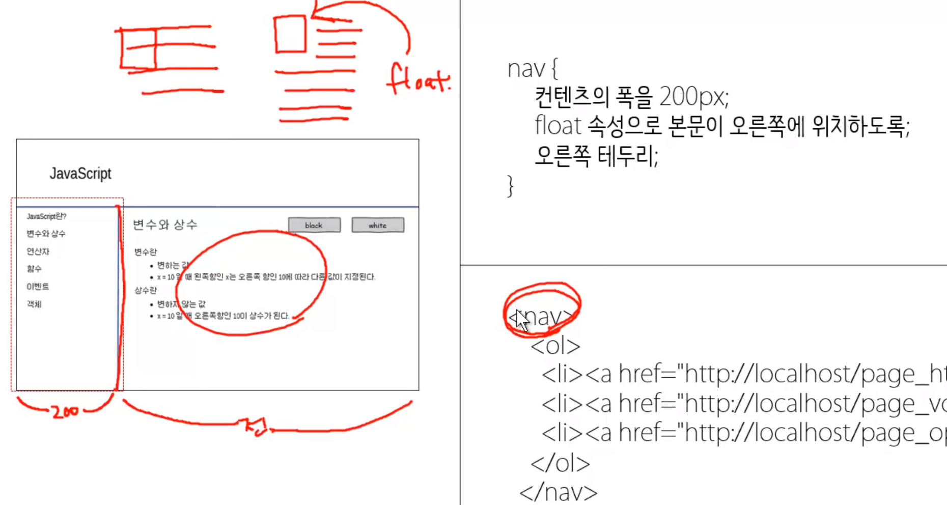 nav{ //오른쪽 테두리 border-right:1px solid gray; width:200px; //폭 height:600px; //높이(테두리) float:left; //왼쪽으로 } |